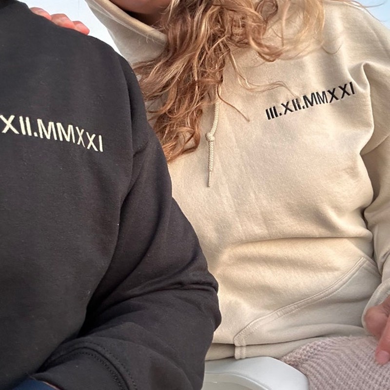 Custom Embroidered Roman Numeral Sweatshirt Hoodie With Initial On Sleeve For Couple Valentine's Day Anniversary
