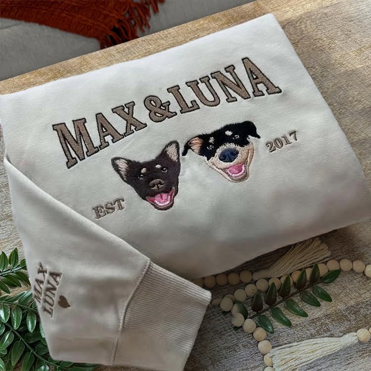 Show off your love for your furry best friend with our custom pet face sweatshirt, hoodie, or T-shirt! Our Custom Dog Cat Face and Name Embroidered clothing is the perfect gift for any dog mom or dad! Featuring a personalized dog portrait from your pet’s photo, this sweatshirt is a heartfelt way to keep your furry friend close.